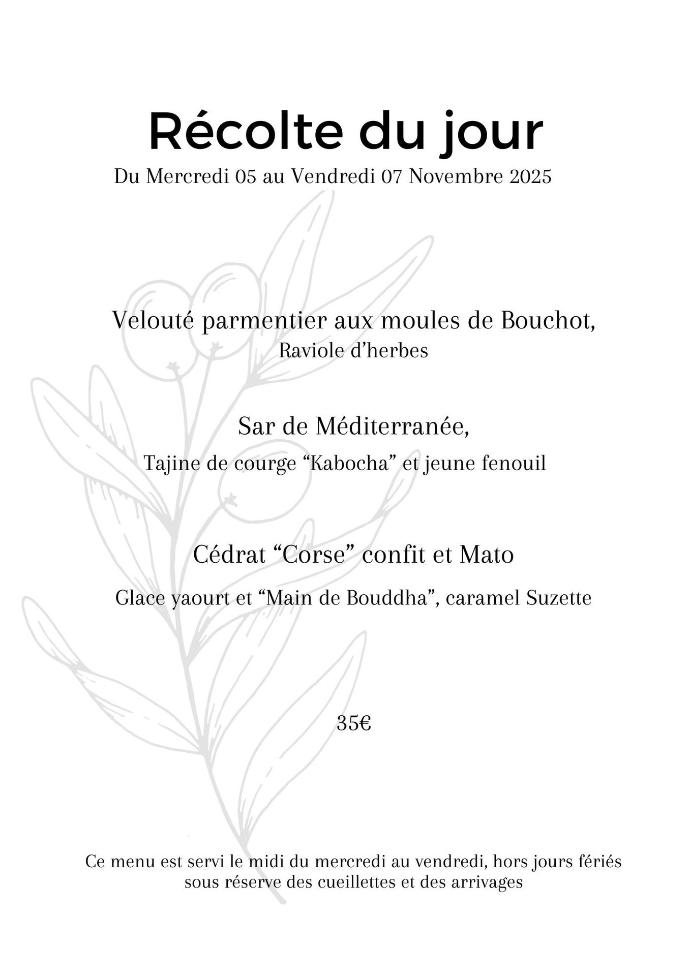 Chaque jour, le Chef donne libre cours à son inspiration, selon la saison, et propose une entrée, un plat et un dessert à partir de produits rares et nobles. Création éphémère pour gourmets curieux.